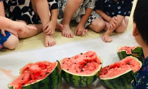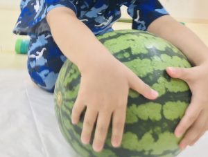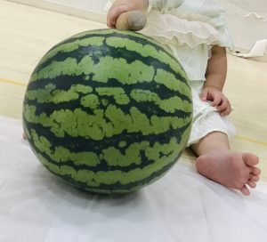 乳児クラスは大きなすいかを前に、