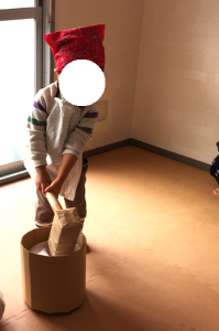 まずは、段ボールで作った杵と臼を使って餅つき体験をしました。