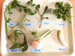 七草を実際に指先でつまんで、そっとにおいを嗅いで…特有の青みを感じたようで「くっさ~」と楽しそうでした。