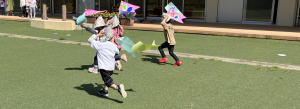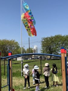 4歳児(くるみぐみ)さんは、みんなでこいのぼりを持って、よーいどん!