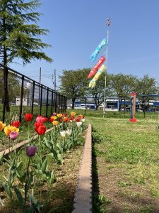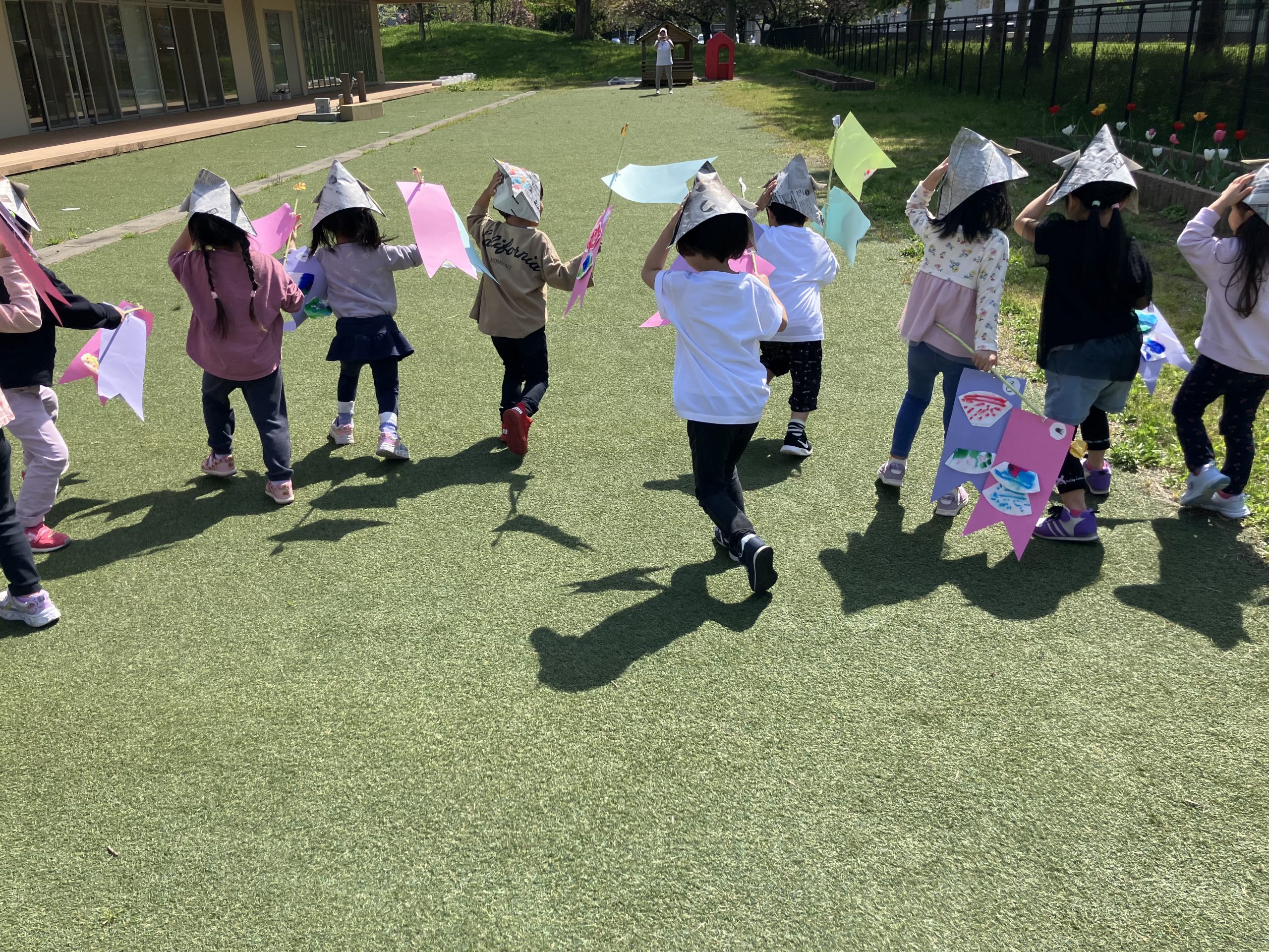 暖かな日差しが降り注ぐ中、自分たちで作った兜をかぶり鯉のぼりを持って園庭へ!