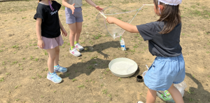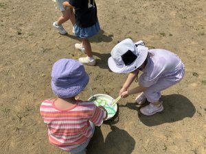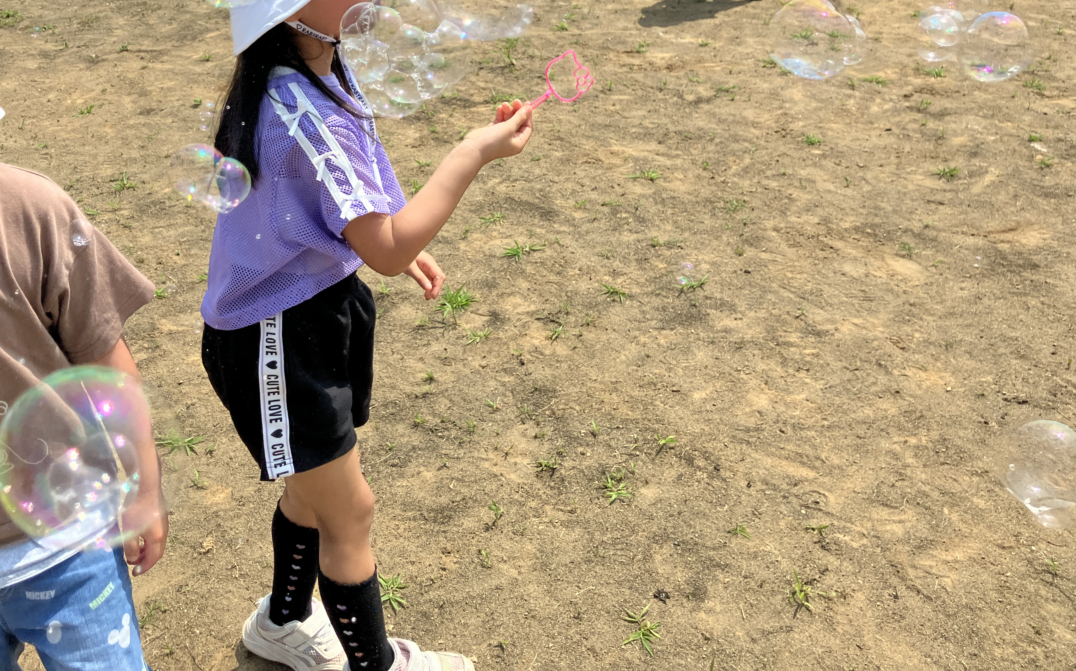 1年生のお兄さん・お姉さんが事前に準備し、作ってくれた色々なシャボン玉の道具を使って一緒に遊びました😊