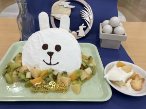 9月のお誕生日ケーキのテーマは「うさぎ」です🐰 フワフワのスポンジに、果物を沢山はさみました。 お子様のケーキには、かわいいうさぎの形のクッキー付きです🐰