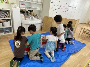 教室にビニールシートを敷いて、担任がセッティングをしているのをわくわくした顔で見つめています。