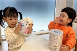 乳児クラスでは廃材(ミルク缶)を使って太鼓を作ったり、身近な玩具を使って音を出し、体全体で楽しめる活動を行いました。