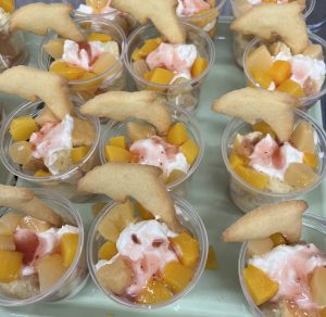 誕生会のおやつは旬の果物、桃のジュレを使ったイルカパフェ。