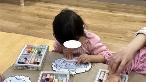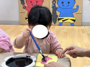 0歳児クラスのお子様もスタッフと一緒にお面を作りました。