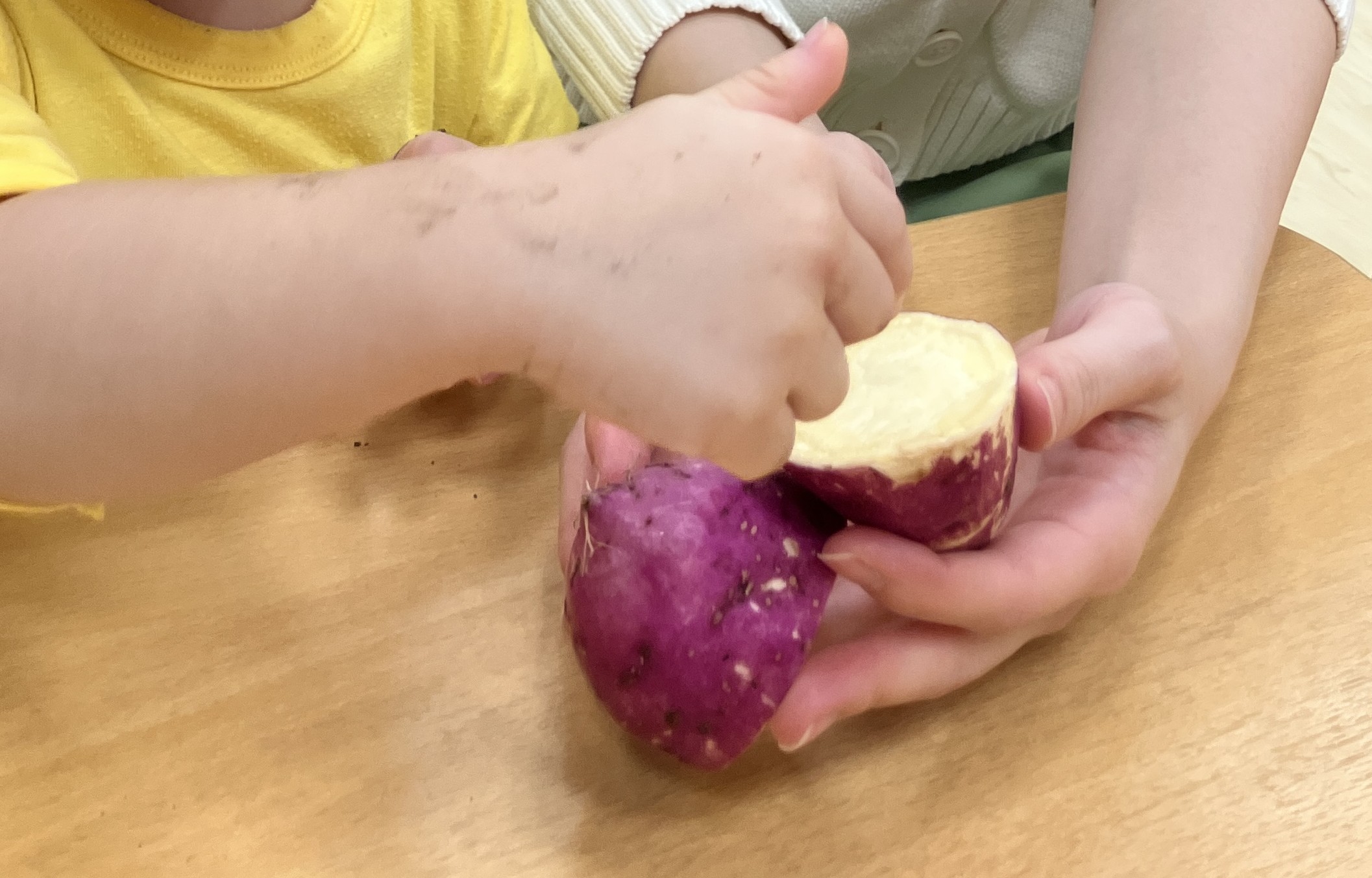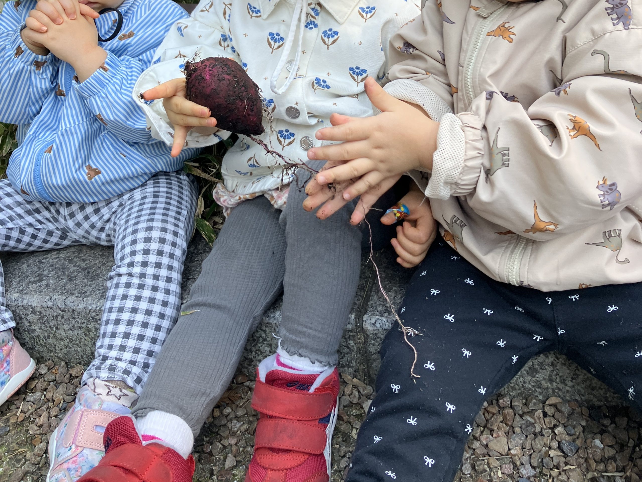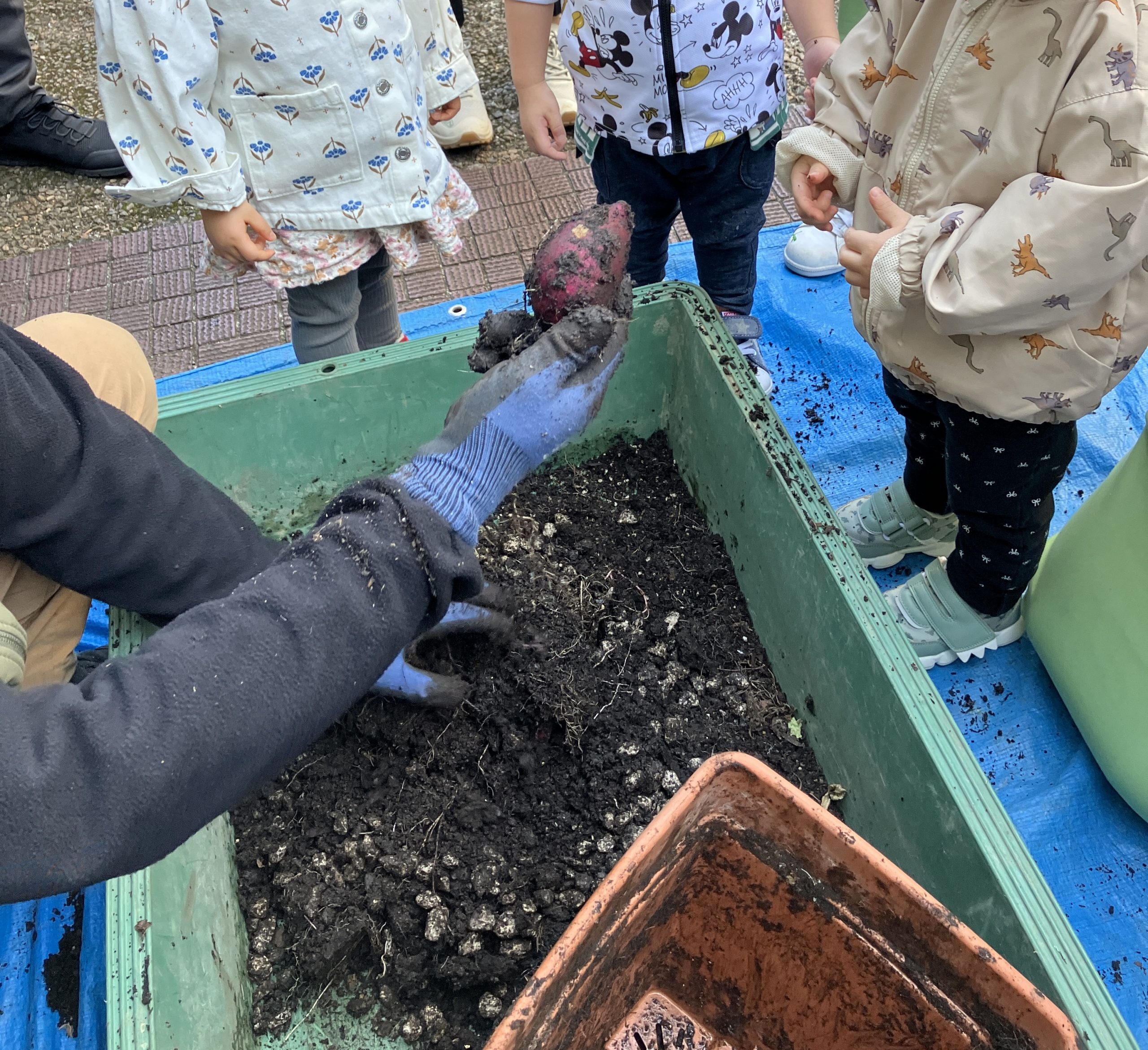 採れたさつま芋を嬉しそうにお友だちと見せ合っていました😊