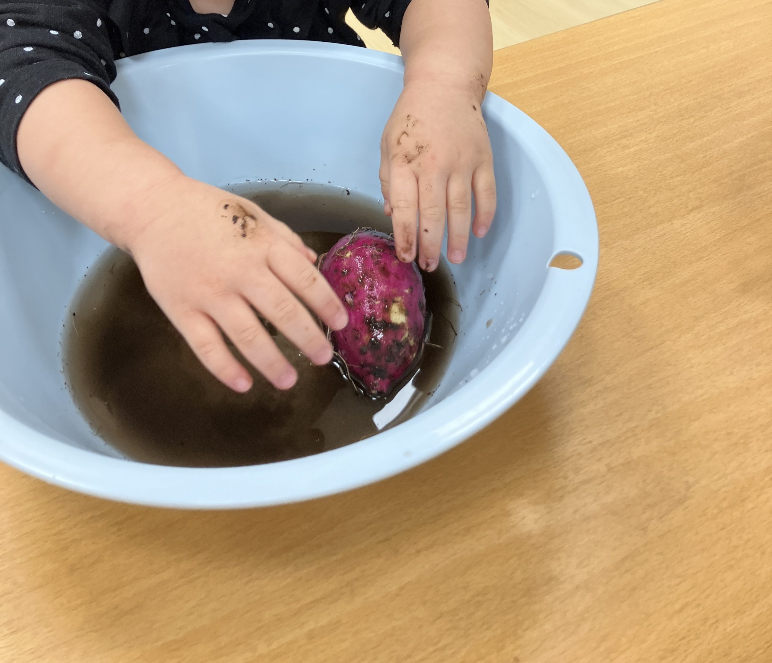 採れたさいつま芋を園に持って帰り水でよく洗うと、