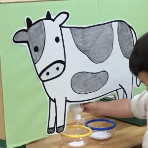 お子さまたちは疑似体験を通して牛から牛乳が作られ、