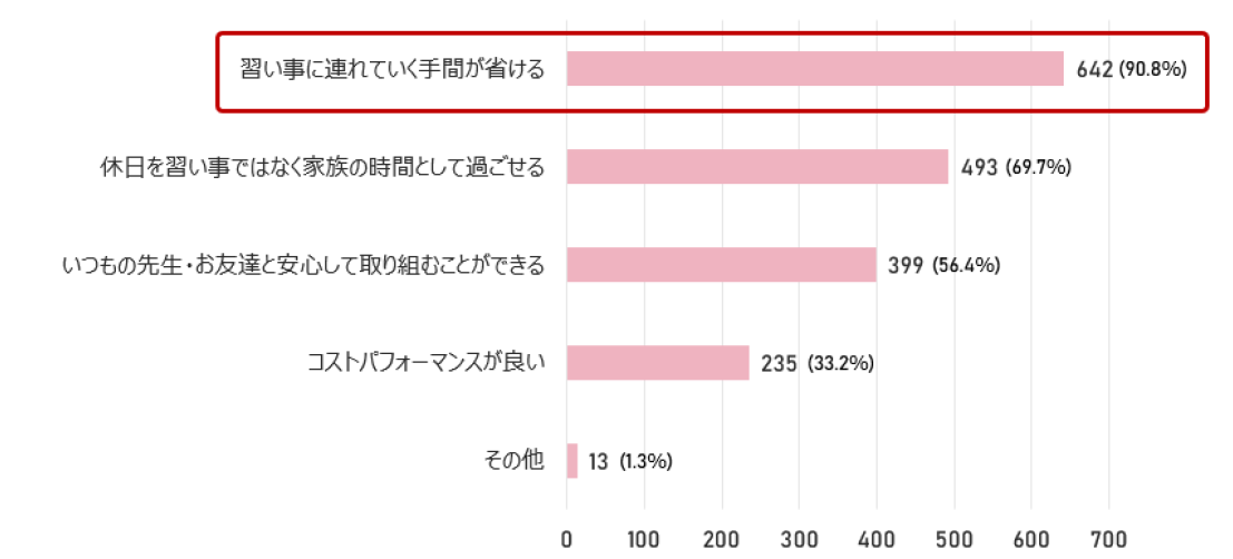 9割が「習い事に連れていく手間が省ける」、7割が「休日を習い事ではなく家族の時間として過ごせる」を選択