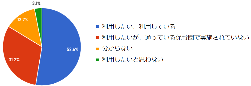 今回の調査結果では、8割以上の保護者が付加的保育「利用したい」と回答しました。そのうち約3割で利用したいが、園でまだ実施されていないと回答。