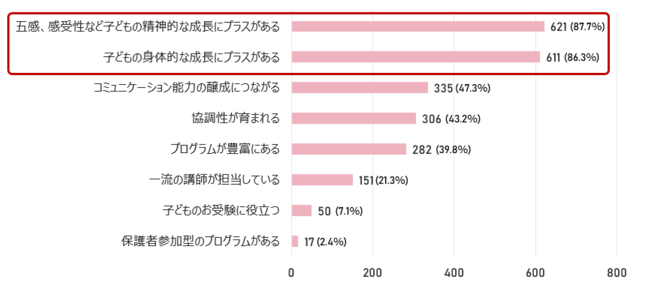 また、付加的保育で重要な要素としては、8割以上の保護者が「お子さまの身体的な成長や五感・感受性など精神的な成長にもプラスになる」と回答しました。(複数回答)