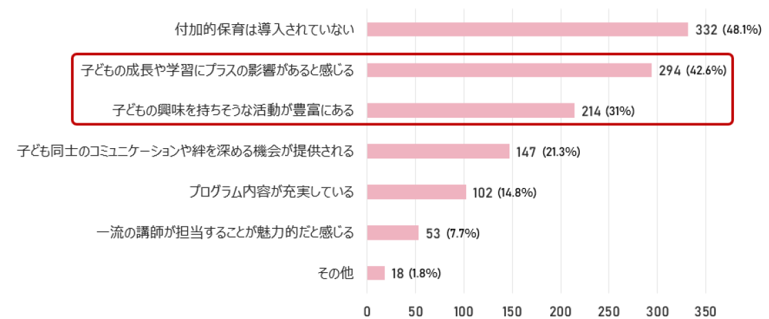 4割が「子どもの成長や学習にプラスの影響があると感じる」、3割が「子どもの興味を持ちそうな活動が豊富にある」を選択