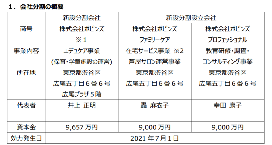 株式会社ポピンズは、会社分割(新設分割)により、新たに「株式会社ポピンズファミリーケア」に在宅サービス事業(ナニーサービス、シルバーケアサービス)および芦屋サロン(高齢者向けデイサービス施設)運営事業を、また「株式会社ポピンズプロフェッショナル」に教育研修・調査・コンサルティング事業を、それぞれ承継いたしました。会社分割の概要につきましては、下記の内容をご確認いただきますようお願い申し上げます。 新体制のもと、従業員一同、努力研鑽してゆく所存でありますので、今後とも一層のご支援を賜りますよう心よりお願い申し上げます。