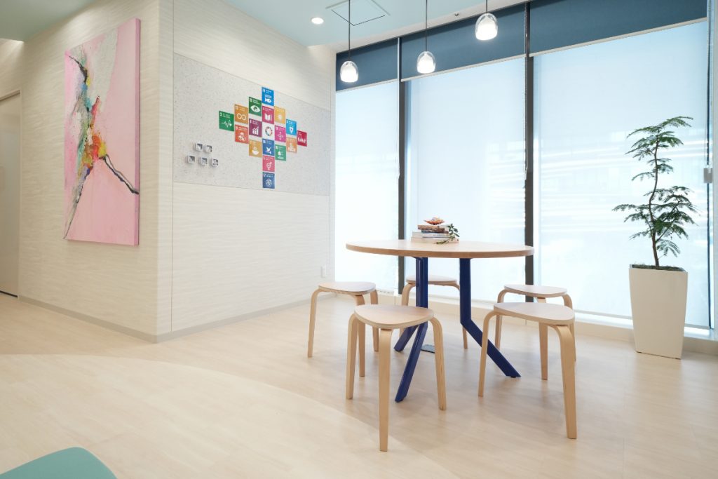 室内全体の壁や天井にはどこまでも広がる空が描かれ、保育室に加えてお子様がのびのびと過ごせるピアッツァ(広場)や、食育にも使える広々としたランチホール(ダイニング)も備えています。また、保護者様が活用できるコワーキングスペースも設置しています。
