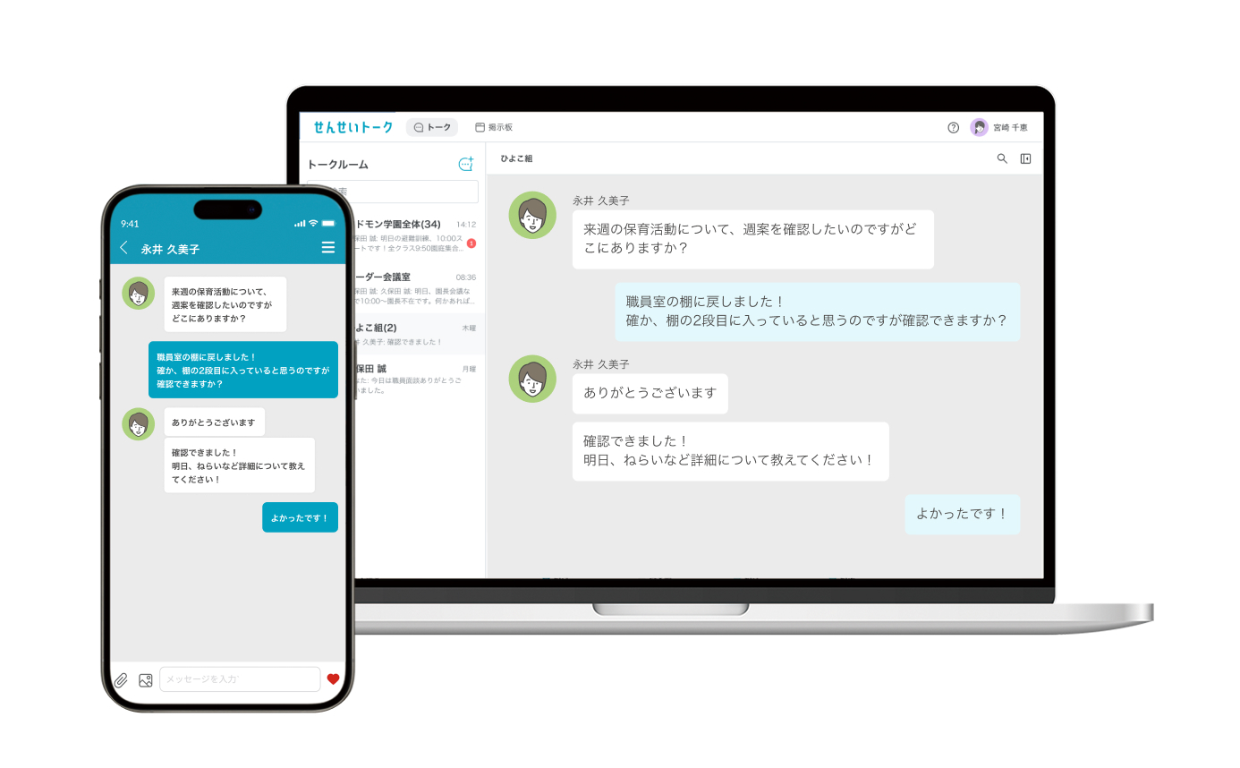 株式会社コドモンが提供する「せんせいトーク」(※1)は、こども施設で働く職員同士の円滑なコミュニケーションのための、業務連絡ツールです。個人のアカウントや電話番号を教え合うことなく、メッセージの送受信、写真や動画の共有といった機能が利用できます。